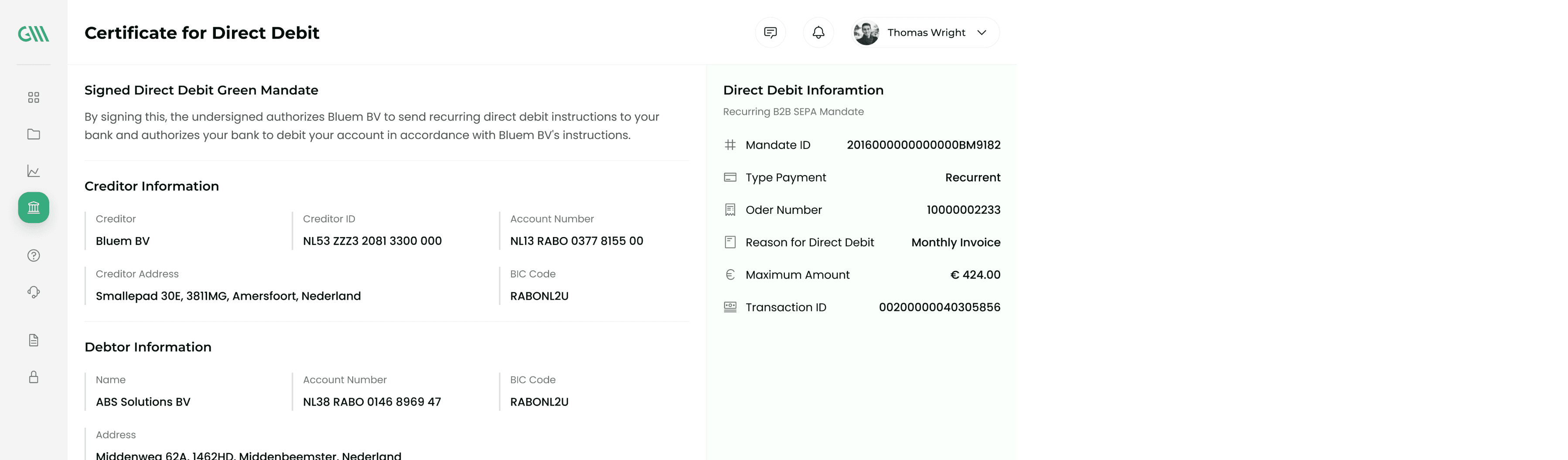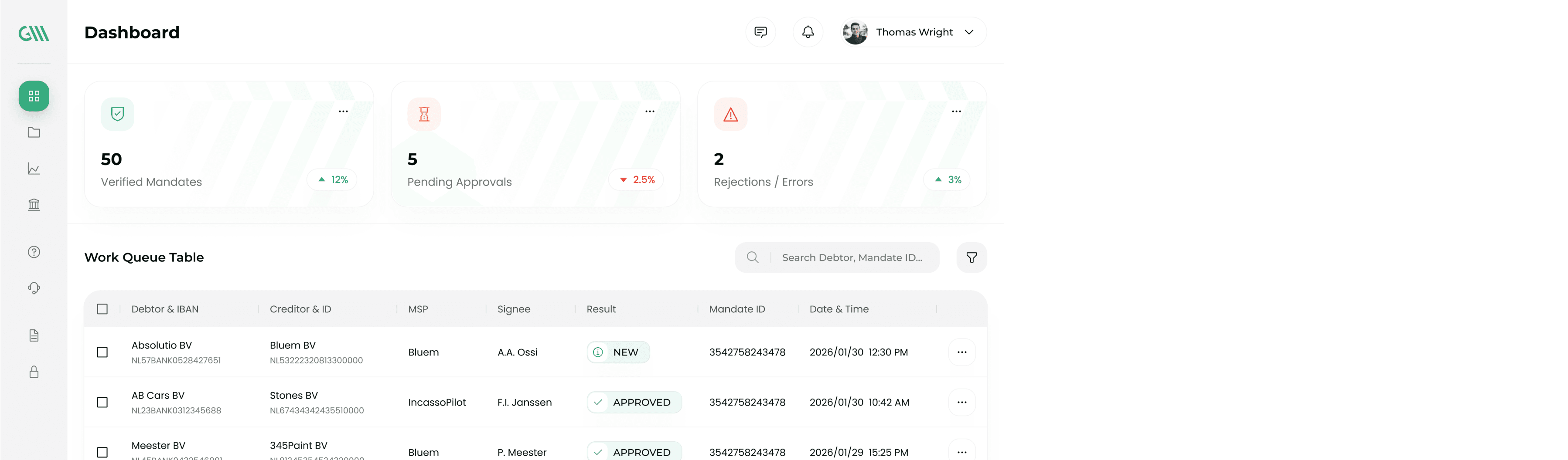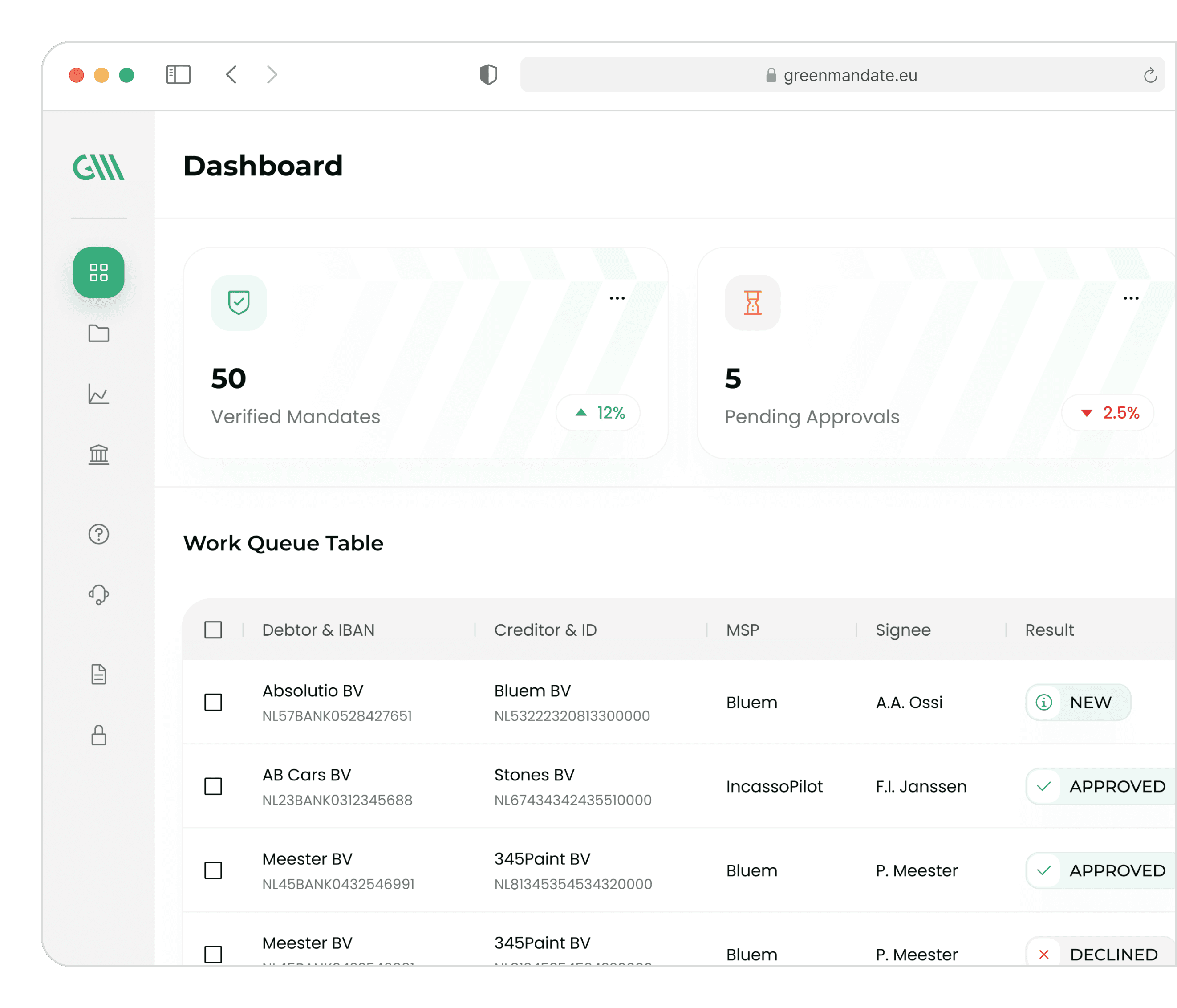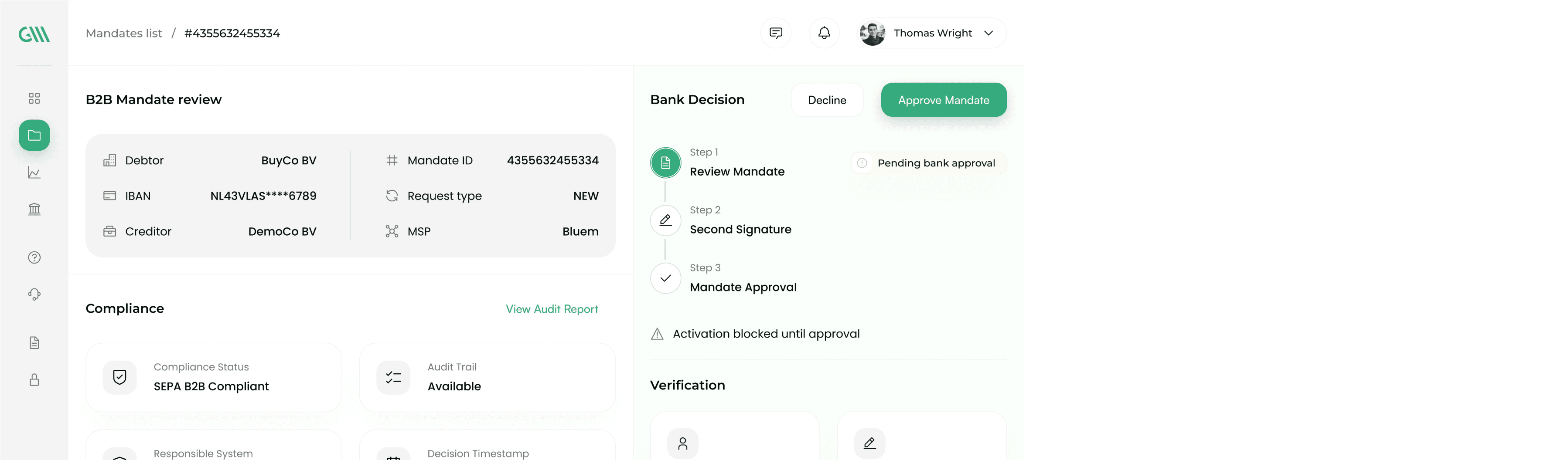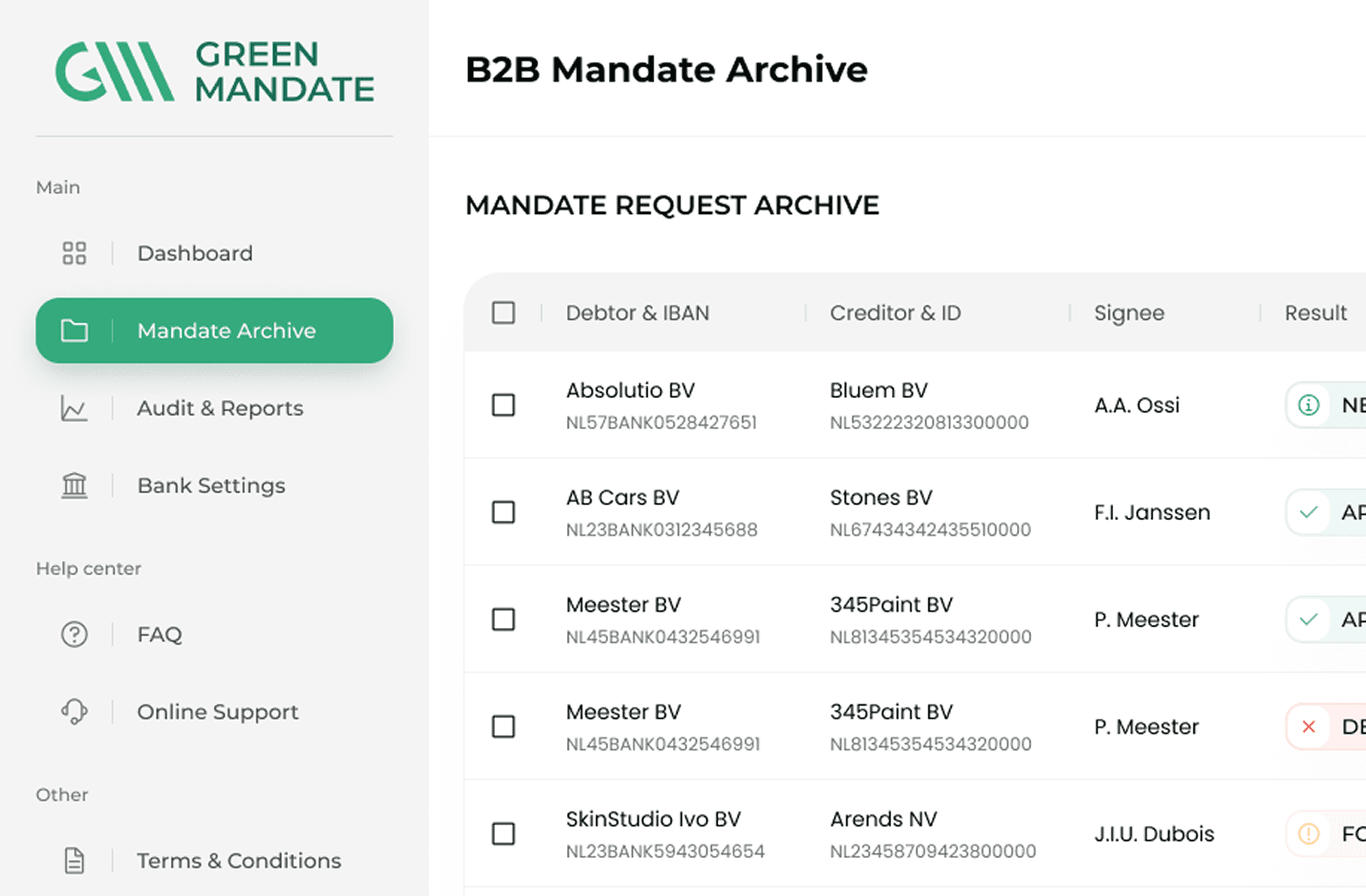 Green Mandate ermöglicht Banken, B2B-Lastschriftmandate von jeder Partei effizient über eine dedizierte Bankkonsole und eine sichere Routing-Schicht zu empfangen, zu verifizieren und zu registrieren.